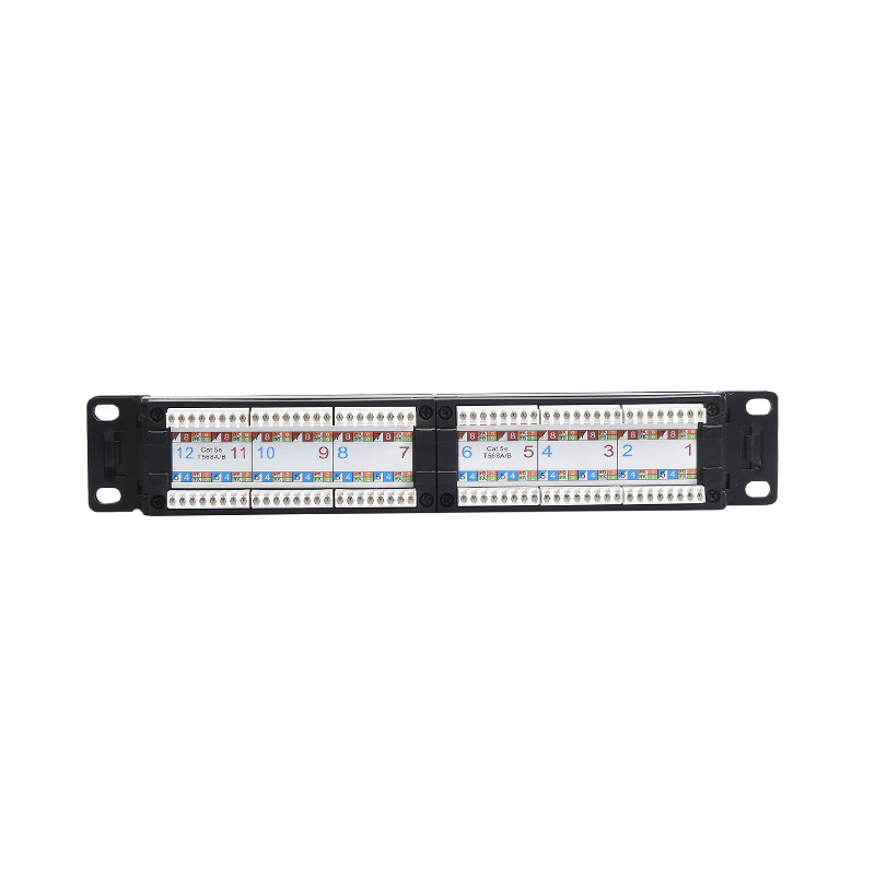 En CAT5E -patchpanel är en enhet som används för att organisera och hantera nätverkskablar i ett strukturerat kablingssystem. Den inkluderar vanligtvis en serie portar, som var och en kan anslutas till en nätverkskabel, vilket gör att kablar kan vara enkelt anslutna och kopplade vid behov. "CAT5E" -beteckningen hänvisar till kategorin för kabeln som panelen är utformad för att stödja, i detta fall kategori 5 förbättras.